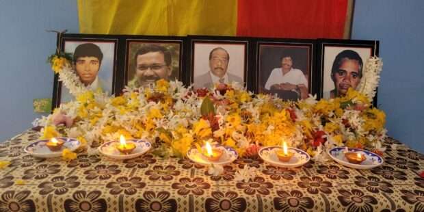 அன்ரன் பாலசிங்கம் மற்றும் அரசியல் துறை பொறுப்பாளர் தமிழ் செல்வன் உள்ளிட்ட மாவீரர்களின் படங்களுடன் ஒன்று கூடிய போராளிகள்